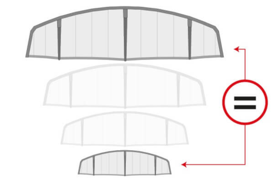 Die Fronttube verfügt über transversale Tuchformung, die die Oberfläche in dem wichtigsten Bereich des Aerofoils sauberer und straffer macht. Das Ergebnis: weniger turbulente Luftströmung und längere Haftung des Tuchs, was das Verhältnis von Auftrieb zu Widerstand verbessert und die Gesamtperformance steigert.